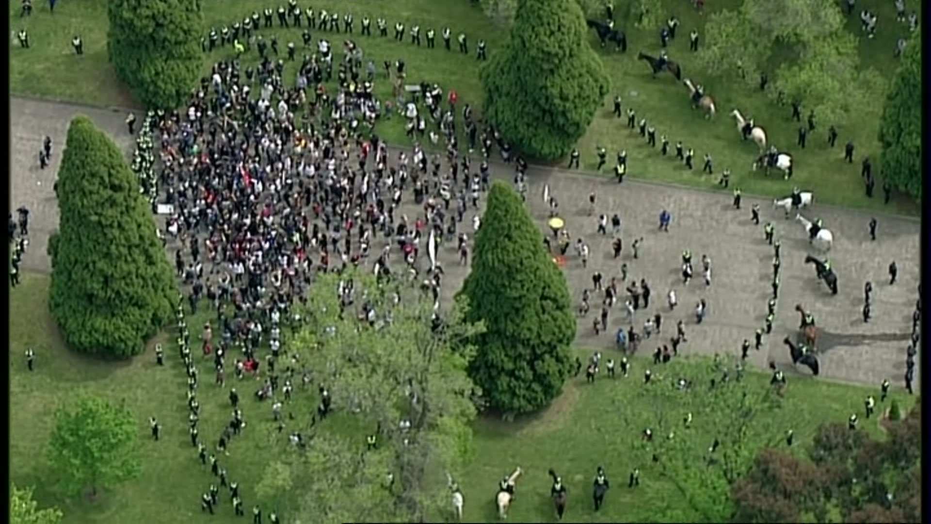 More than 100 people clashed with victoria police on the steps.
